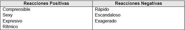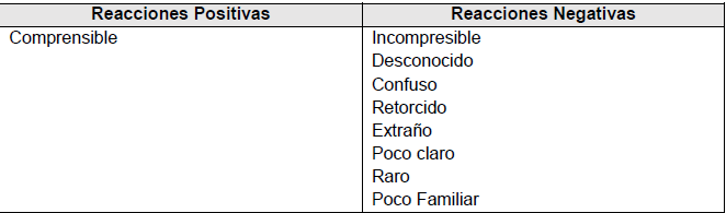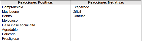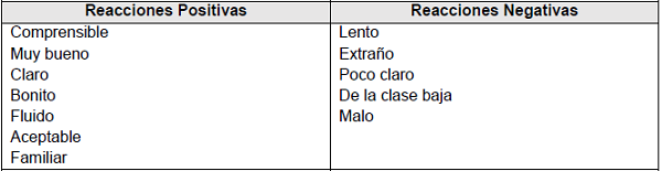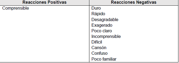 En la Tabla 5, desafortunadamente se evidencia que la mayoría de los encuestados mostró reacciones negativas frente a este acento. Del mismo modo, pocos lo describieron como “comprensible”.