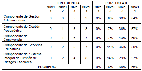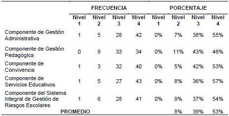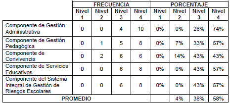 Los resultados de la autoevaluación, expresados en la Tabla 2, generan una visión intrínseca de la tarea docente que día a día se realiza. Así, se tiene en el componente gestión administrativa, se detectó que un 64% de docentes, están en el nivel 4, mientas que los restantes, esto es el 36%, en el nivel 3. En gestión pedagógica, un 57% de docentes, se ubican en el nivel 4; un 36%, en nivel 3, y 7%, en nivel 2. Para el componente convivencia, se detectó que un 50% de docentes, están en el nivel 4; el 43%, en el nivel 3; y el 7% en el nivel 2. En el componente servicios educativos, se estableció que se ubica un 50% de los docentes, en el nivel 4; un 36%, en el nivel 3; y 14%, en el nivel 2. Por último, en el componente Sistema Integral de Gestión de Riesgos Escolares, el 57% de los docentes, se encuentran en el nivel 4, un 29% en el nivel 3, y un 14% en el nivel.