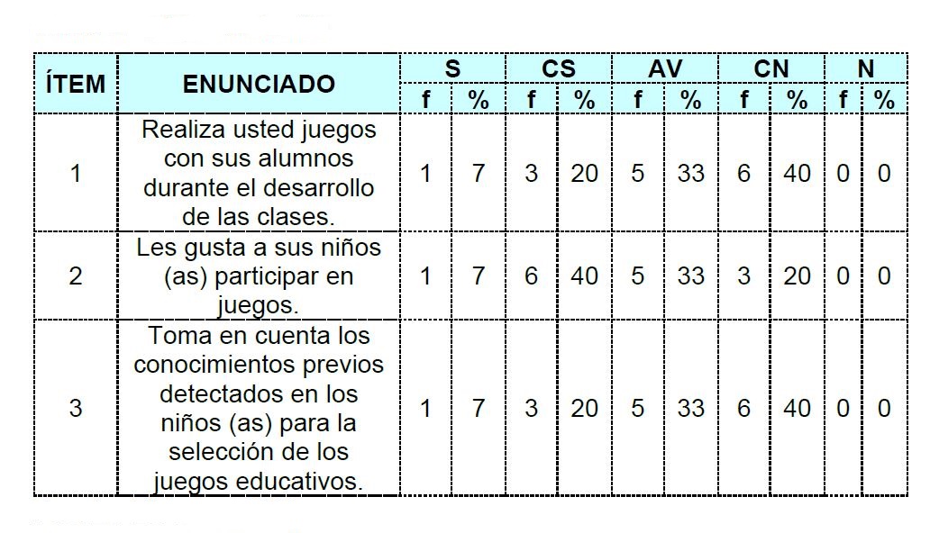 Para el ítem 1, referido a si realizan juegos con sus alumnos durante el desarrollo de las clases, se evidenció que el 40% de los sujetos encuestados expresaron que casi nunca realizan juegos, un 33% expresó que algunas veces y un 20% casi siempre.