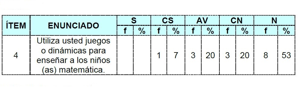 En cuanto al ítem 4, relacionado a si el docente utiliza juegos o dinámicas para enseñar a los niños (as) matemática, se evidenció el 53% de los docentes manifestaron que nunca, 20% casi nunca y otro 20% casi siempre. Con dichos resultados, se evidenció que existe una baja tendencia de los docentes en facilitar las clases de matemática de manera divertida. Por consiguiente, se puede afirmar que las clases son monótonas y repetitivas con los mismos métodos y estrategias tradicionales.