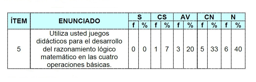Finalmente, para el ítem 5 donde se preguntó si el docente utiliza juegos educativos para mejorar el razonamiento lógico de las cuatro operaciones básicas, se constató que el 40% expresó nunca, un 33% que casi nunca y un 20% algunas veces. Estos resultados, muestran una baja tendencia de los docentes en considerar importante el desarrollo del pensamiento lógico como un proceso básico para la realización de operaciones racionales en matemática.