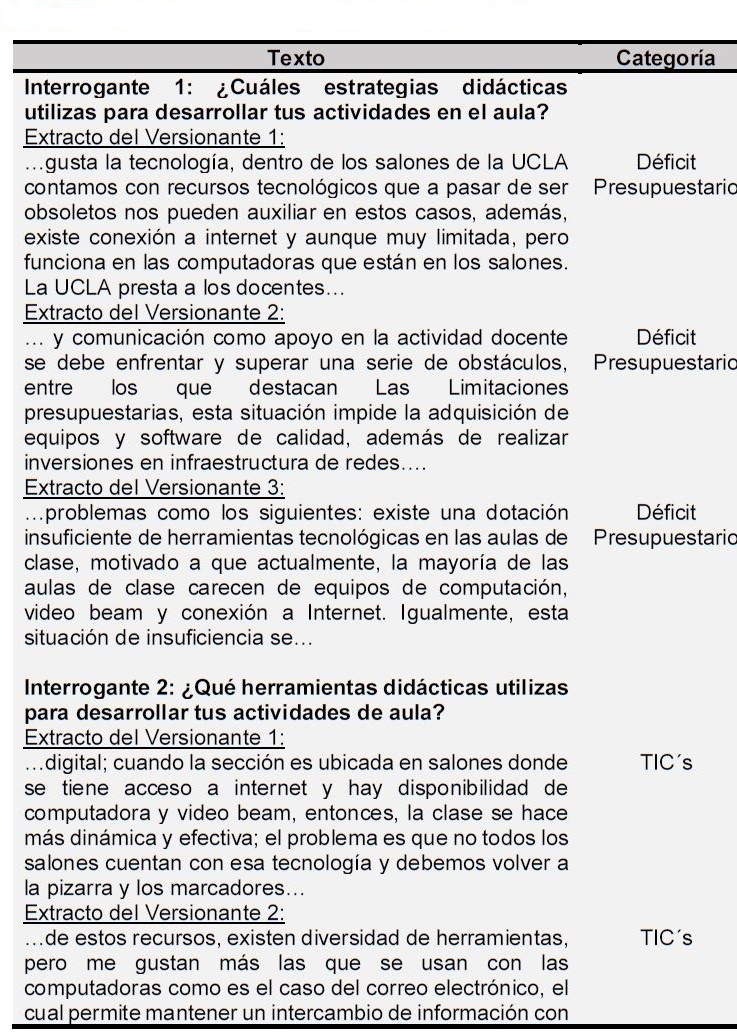 Esta realidad obtenida, me permitió conocer e interpretar desde la transcomplejidad, como se integran las TIC´s en el sistema universitario, además desde las voces de los versionantes obtenidas en las entrevistas realizadas, tabuladas y de las cuales se presentan los extractos que dan origen a las categorías Déficit Presupuestario y TIC´s. (Cuadro nro. 1).