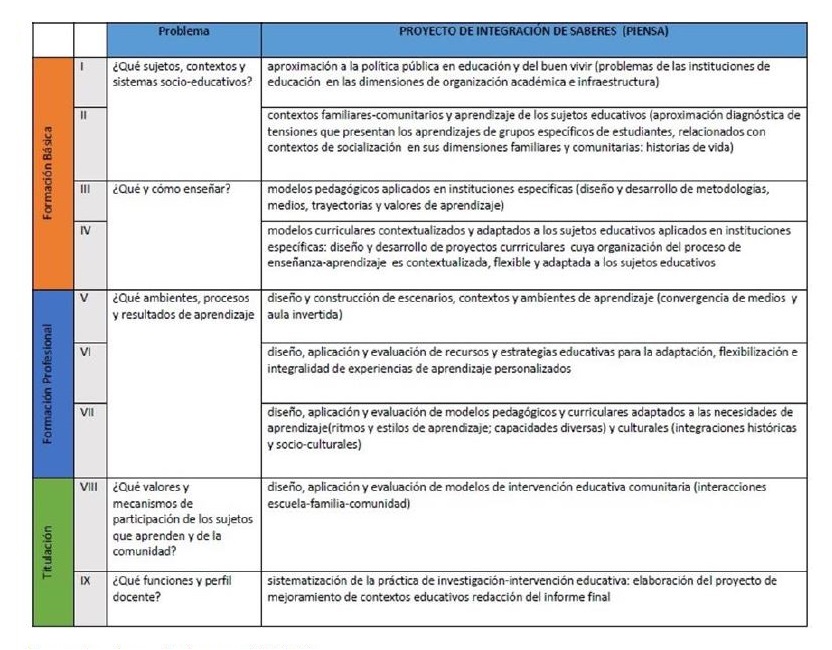 · Énfasis en el desarrollo de competencias para la atención y construcción de soluciones a situaciones, casos y problemas educativos (ciclo a ciclo), mediante los proyectos integradores de saberes (PIENSA) que los estudiantes realizan con pertinencia social según el acompañamiento de sus tutores académicos y de asignatura en escenarios educativos. El PIENSA constituye un dispositivo pedagógico y didáctico para el desarrollo de competencias investigativas en escenarios profesionales.