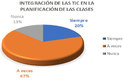 Sin embargo, en la figura 3 se evidencia que el 67% de los docentes integra a veces la tecnología dentro de sus planificaciones, ante este panorama surgen algunas cuestiones ¿Cuál es la finalidad de su integración?,