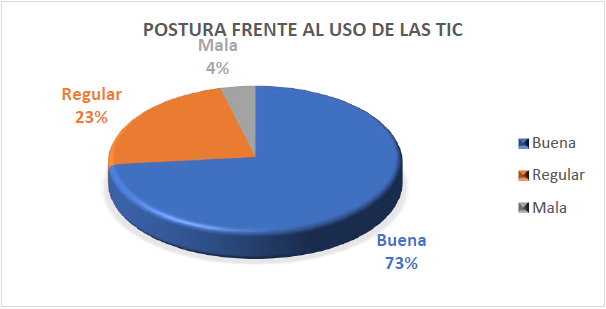 Como parte de la integración se necesita una postura positiva y de motivación para enfrentarse hacia los nuevos retos de la sociedad digital, como se visualiza en la figura 4, el 73% de docentes tienen una buena postura frente al uso de las TIC, surgiendo la necesidad de repensar el accionar docente dentro de la Universidad, donde se proponga conocer, analizar y actualizar sus procesos de enseñanza- aprendizaje en la formación virtual, mediante plataformas virtuales que validen el desarrollo de competencias digitales en la construcción de aprendizajes en el marco de Modelo Pedagógico de la UNAE.