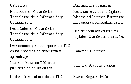 Tuvo una muestra de 82 docentes de las diferentes carreras de educación básica, inicial, especial, intercultural bilingüe y profesionalización durante el período de octubre del año 2018 a marzo del año 2019. Para la recolección de la información se empleó un cuestionario semiestructurado conformado por 10 preguntas, cuya validación se realizó por pares académicos (jueces) en base a criterios de fiabilidad, claridad que permitió realizar un diagnóstico sobre las perspectivas de los docentes frente al uso de las tecnologías en sus prácticas pedagógicas, en donde se establecieron cuatro categorías que se presentan en la tabla 1.
