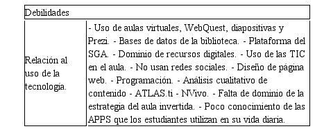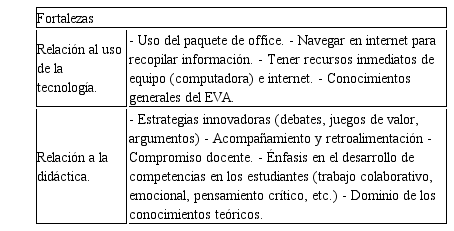 En la tabla 2, se evidencia que las fortalezas que poseen los docentes se direccionan en relación al uso de la tecnología y al dominio de la didáctica. Sin embargo, cuando referimos al uso de las tecnologías se vincula estrechamente a competencias básicas de uso de las TIC en actividades cotidianas y necesarias como el uso del paquete de office, el navegar por internet y uso general de los entornos virtuales que no les permite realizar una verdadera transformación en su accionar docente.