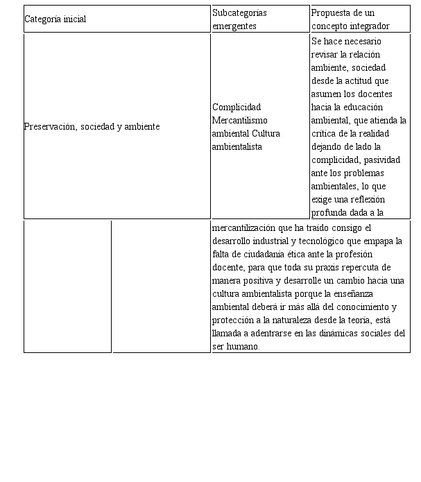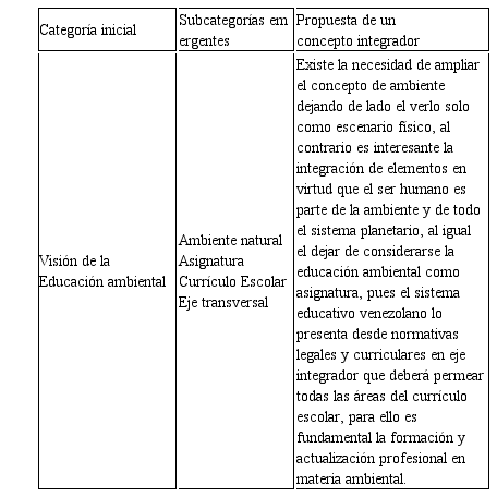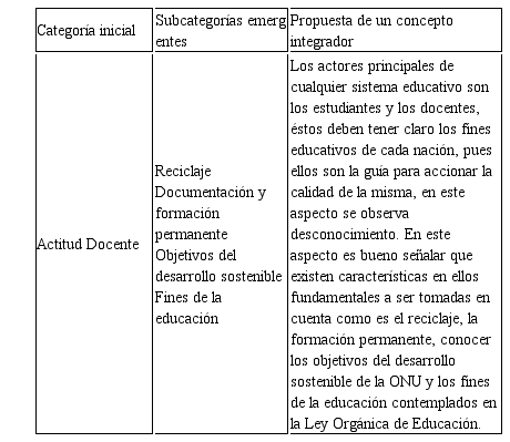 Las respuestas emitidas por los sujetos en estudio en la tabla 2, consideran la categoría inicial y afirman que el nivel plasmado en el aprendizaje de la educación ambiental desde su praxis no ha dado respuesta satisfactoria a la sociedad, esto lo mide el docente a través del poco compromiso para generar actitudes favorables hacia el ambiente