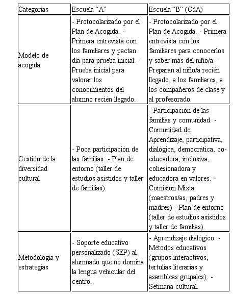 Los resultados obtenidos después de los análisis de documentos y entrevistas ponen de manifiesto que las prácticas inclusivas e interculturales decaen más en el Centro B (Comunidad de Aprendizaje) que en el A (CEIP). No obstante, cabe señalar que hay una práctica que las dos escuelas tienen en común: la acogida de los alumnos recién llegados mediante un plan de acogida protocolizado. Junto a Carbonell (2006b): cabe afirmar que las acogidas han de ser cálidas y personales, donde la comunidad educativa debe intentar ofrecer un buen recibimiento al estudiante y también a sus familiares, puesto que en muchas ocasiones los parientes de los alumnos son dejados de lado sin tener en cuenta que representan un pilar fundamental para el desarrollo integral de los más jóvenes (pág. 10).
