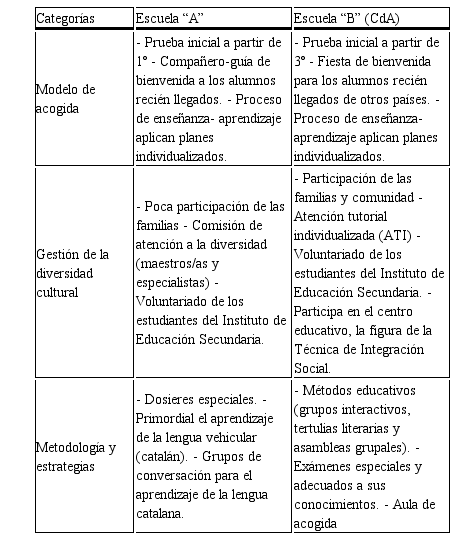 Resumiendo lo destacado en la tabla 2, cabe mencionar que la escuela “A” y la escuela “B” tienen procedimientos claramente protocolarizados y no tan actitudinales. Teniendo en cuenta las aportaciones de Carbonell (2006a): los planes de acogida que se han elaborado desde hace varios años en los centros educativos tendrían que dejar de ser protocolizados y fríos en la recepción administrativa de los recién llegados y transformarse en actitudes y actuaciones más humanizadas (pág. 8). Además, en la escuela “B” se realiza la llamada Setmana Cultural, una práctica no intercultural. Según Sabariego (2009c): la semana cultural que imparten algunas escuelas como estrategia de integración de las diversas culturas estaría catalogada en el currículum multicultural, así, en vez de trabajar las igualdades, más bien, se marcan las diferencias (pág. 240). A través de estas diferencias culturales se ponen de relieve las distancias étnicas, religiosas, gastronómicas, etc., motivo por el que no siempre son prácticas adecuadas para fomentar la interculturalidad como valor en las escuelas.