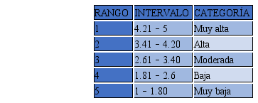 Para el procesamiento de los datos, se aplicó estadística descriptiva, utilizando para ello el promedio y la desviación como medidas de análisis, lo cual requirió la construcción de dos cuadros baremos, los cuales se presentan a continuación. El primer baremo, presentado en el cuadro 2, detalla los rangos, intervalos y categorías consideradas para la interpretación del promedio. El mismo fue construido sobre la base de la valoración cuantitativa asignada a las cinco (5) alternativas de respuestas.