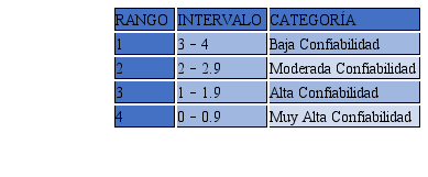 El segundo baremo, mostrado en el cuadro 3, se diseñó para interpretar los valores de desviación estándar, los cuales refieren el nivel de confiabilidad de las respuestas. El mismo fue construido sobre la base de la menos (0) y mayor (4) dispersión obtenida con la aplicación del instrumento para cada ítem o reactivo. Al respecto, estadísticamente la desviación es inversa a la confiabilidad, es decir, que mientras mayor dispersión o desviación, menor será la confiabilidad.