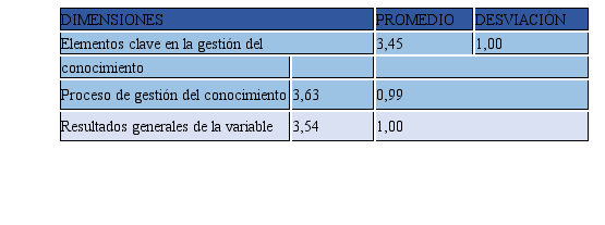 En relación a la variable en estudio, referida a la Gestión del Conocimiento y a sus dimensiones, como se observa en el cuadro 4, los resultados generales obtenidos una vez procesados los datos, arrojaron un promedio general de 3,54, indicando una categoría alta, y una desviación estándar de 1,00, ubicándose en la categoría de baja, lo cual refleja una alta confiabilidad de las respuestas