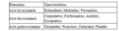 Acto ilocucionario: se refiere a la intencionalidad con la que se habla, el propósito que se desea alcanzar con el discurso, por consiguiente, el discurso del docente como líder transformacional debe mantener una fuerza intencional cargada de estímulo intelectual, motivación, carisma, inspiración, y reconocimiento individual, inspirando el alcance de objetivos tanto individuales como comunes, promoviendo la transformación del conocimiento e indicando la ruta hacia el éxito.