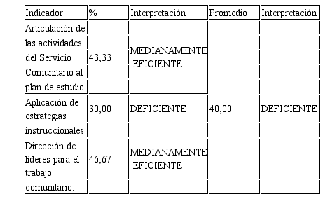 Gracias a la información suministrada por ambas poblaciones (docentes y estudiantes), se pudo comprobar que el rol del docente en este aspecto es deficiente, es decir, el tutor no posee las habilidades requeridas para el desarrollo exitoso del servicio comunitario, pese a que algunos casos articulan las actividades y logran en cierta medida la dirección de líderes comunitarios, se consideró debido a los porcentajes obtenidos que no es suficiente para garantizar la presencia de las habilidades asociadas al diseño e implementación de estrategias de aprendizaje que conlleven al logro de los objetivos del servicio comunitario.