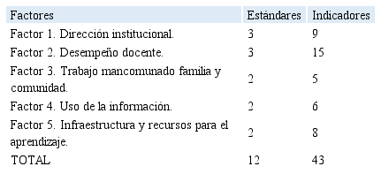 En consecuencia, la calidad educativa tiene relacionado entre sí, porque los estándares permiten elaborar las variables y los indicadores se ejecutan en función del estándar. El IPEBA, para medir la gestión educativa, planteo: 5 factores, 12 estándares y 43 indicadores; tal como se puede ilustrar en la tabla 1.