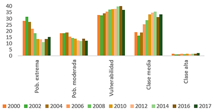 De acuerdo con, Stampini, Robles, Sáenz, Ibarrarán y Medellín (2015b): el aumento se da especialmente en los primeros años, y comienza a detenerse desde el año 2012, al empezar a descender el precio de las materias primas. El gráfico 2, recoge la distribución de los ingresos por clase social en promedio para los países de la CAN. El gráfico muestra cómo, a pesar del aumento del volumen de personas que pertenecen a la clase media, el grupo en condición de vulnerabilidad es el prioritario en la región. El reto es lograr que las familias en condición de pobreza y vulnerabilidad pasen a engrosar la clase media. Las familias en condición de vulnerabilidad tienen cinco veces más probabilidades que el resto de los grupos sociales de pertenecer durante la siguiente década al estado de pobreza.