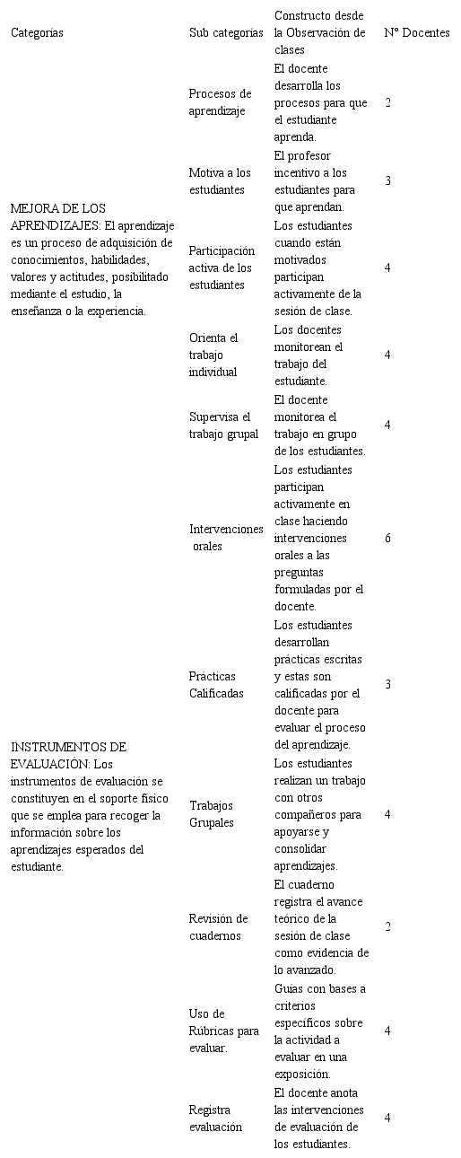 Para la identificación de las categorías, se codificaron las fuentes que fueron el Grupo Focal con seis estudiantes, las entrevistas con seis docentes y las fichas de observaciones de clases de los docentes. En este sentido, y como presenta Galeano (2004): se hizo la triangulación del análisis de las conclusiones de cada fuente, se formó el constructo que se dedujo de la triangulación de los códigos encontrados en las fuentes. Se trabajó con seis (6) estudiantes y seis (6) docentes, después de la construcción del constructo y categorización de la información con la ayuda de la codificación de las fuentes y de los mapas semánticos elaborados con el programa ATLAS. Ti 7, se pudo determinar las Categorías: instrumentos de evaluación y mejora de los aprendizajes.