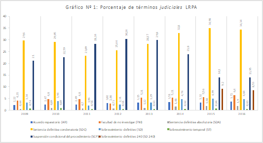 En contra de su explícito ideario original, el actual sistema mostraría una evidente tendencia hacia un mayor uso de la condena, en desmedro de medidas alternativas a la pena[1] u orientadas a la desjudialización. Como se aprecia en el Gráfico 1,[2] entre el 2009 y el 2016, la “sentencia definitiva condenatoria” habría sido, en cinco de los ochos años, el término judicial con mayor prevalencia.