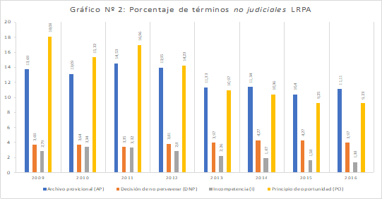 Como se ha señalado, los principios esgrimidos en la LRPA suponen la introducción de un derecho penal especializado y diferenciado de aquel administrado a los adultos. En tal sentido, se trataba de dotar a la justicia de un aparato legal cuya intervención penal positiva y minimalista (CILLERO, 2006) otorgue preferencia a la reinserción social y al uso de medidas alternativas, limitando así la violencia represiva y la privación de libertad (BERRÍOS, 2011; CORTÉS, 2008). De este modo, a juicio de Duce (2010), su condición especializada debía redundar en un conjunto de rasgos distintivos que, por su aplicación, habrían de traducirse concretamente en la duplicación del porcentaje de la “suspensión condicional del procedimiento” y del “principio de oportunidad”, así como en el alcance de “acuerdos reparatorios” en una cantidad 50% superior al número logrado por el sistema penal para adultos.