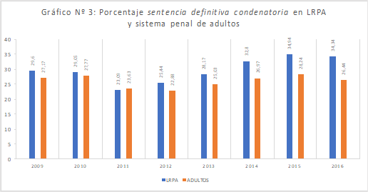 No obstante, al efectuar un análisis comparativo de ambos sistemas, las conclusiones parecen apuntar en el sentido inverso de aquellos esperados estándares diferenciales de juzgamiento penal. En concreto, no sólo es dable observar, desde el año 2011, un aumento gradual de la frecuencia de “sentencias definitivas condenatorias” en los dos sistemas, sino que también se puede constatar una mayor prevalencia relativa de esta medida en causas afectas a la LRPA, por sobre la proporción de la misma en procesos sustanciados bajo el régimen penal adulto (ver Gráfico 3). De esta manera, el análisis indicaría que la nueva modalidad de juzgamiento penal adolescente parece haber amparado un reforzamiento de la condena y de sus funciones punitivas o, al menos, no haber logrado favorecer, con la debida eficacia, el atendido minimalismo de la intervención penal en jóvenes.