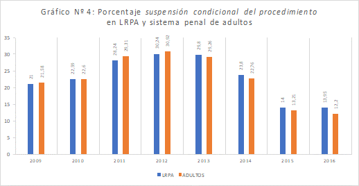 El examen de la información parece, incluso, revelar la inexistencia de diferencias significativas entre ambos sistemas respecto de la frecuencia conferida, desde el año 2010, al uso de la “suspensión condicional del procedimiento”. Además, a partir del 2012, se advertiría una disminución progresiva de su prevalencia en el nuevo régimen penal juvenil (ver Gráfico 4), lo cual también parece ir en dirección contraria a los principios de actuación que, conforme al privilegio electivo de medidas alternativas u orientadas a la desjudicialización, habrían debido regir sobre la aplicación de la LRPA.