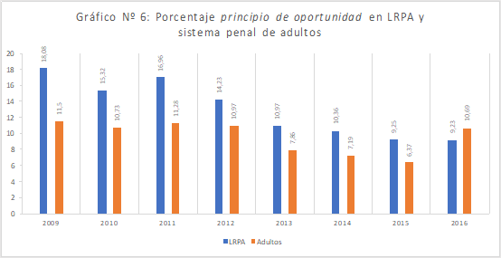 Finalmente, el análisis de la información disponible revelaría que el recurso al “principio de oportunidad” sería la sola modalidad de término que mostraría diferencias significativas conformes con el atendido carácter especial que, según Duce (2011), debería detentar la LRPA. Ciertamente, se trata de la única medida cuya prevalencia ha sido mayor en el sistema penal para jóvenes que en aquel para adultos (ver Gráfico 6). No obstante, en este punto cabe proceder con cautela, toda vez que, desde el año 2009, esta forma de término habría observado una progresiva disminución cercana al 50%, lo cual reafirmaría una vez más la tendencia general del nuevo régimen hacia un menoscabo de los originales propósitos de desjudicialización y limitación de la condena.