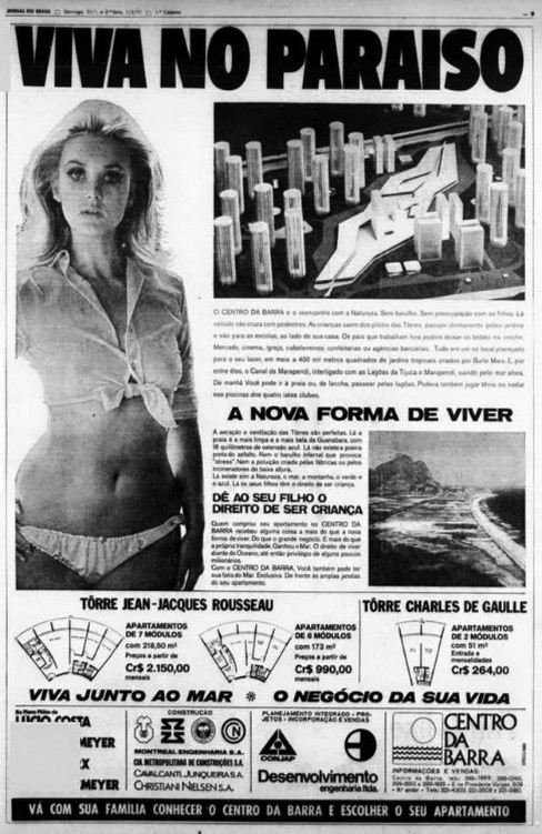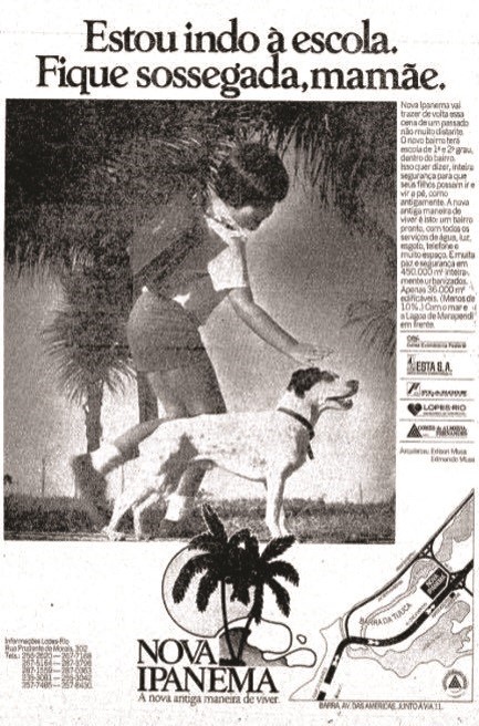 Mas, para além da viabilidade prática garantida pelas obras de infraestrutura, os novos moradores chegavam atraídos pela promessa de uma vida mais calma, prática e segura. Empreendimentos como o Centro da Barra, inaugurado em 1974, ofereciam grandes áreas de lazer e facilidade de acesso a serviços, garantindo aos seus condôminos uma nova maneira de viver. Em propaganda veiculada no Jornal do Brasil em 1971, quando começou a ser construído, o condomínio é apresentado como um paraíso, definido, por um lado, pela modernidade da paisagem construída e, por outro, pela proximidade da praia semivirgem. Com claro apelo a um público formado por homens jovens e economicamente estabelecidos, o anúncio convida o leitor a viver “junto ao mar” e a fazer “o negócio da sua vida”, mobilizando repertórios tão distintos quanto uma bela mulher em trajes sumários e a sugestão de dar ao filho “o direito de ser criança”. Em comum, a ideia de que o novo condomínios reproduzia os atributos da Zona Sul atlântica – como o estilo de vida praiano e a presença de belas mulheres –, acrescendo-lhe os benefícios da segurança e do bucolismo. A ideia é reforçada no anúncio do condomínio Nova Ipanema, de 1975, que tem como alvo jovens mulheres com filhos pequenos. Usando como chamada a frase “Estou indo à escola, fique sossegada, mamãe”, a propaganda mostra um menino caminhando ao lado de seu cachorro, prometendo devolver aos interessados “essa cena de um passado não muito distante” – garantido pelo fato de o condomínio ter uma escola particular dentro de suas dependências.