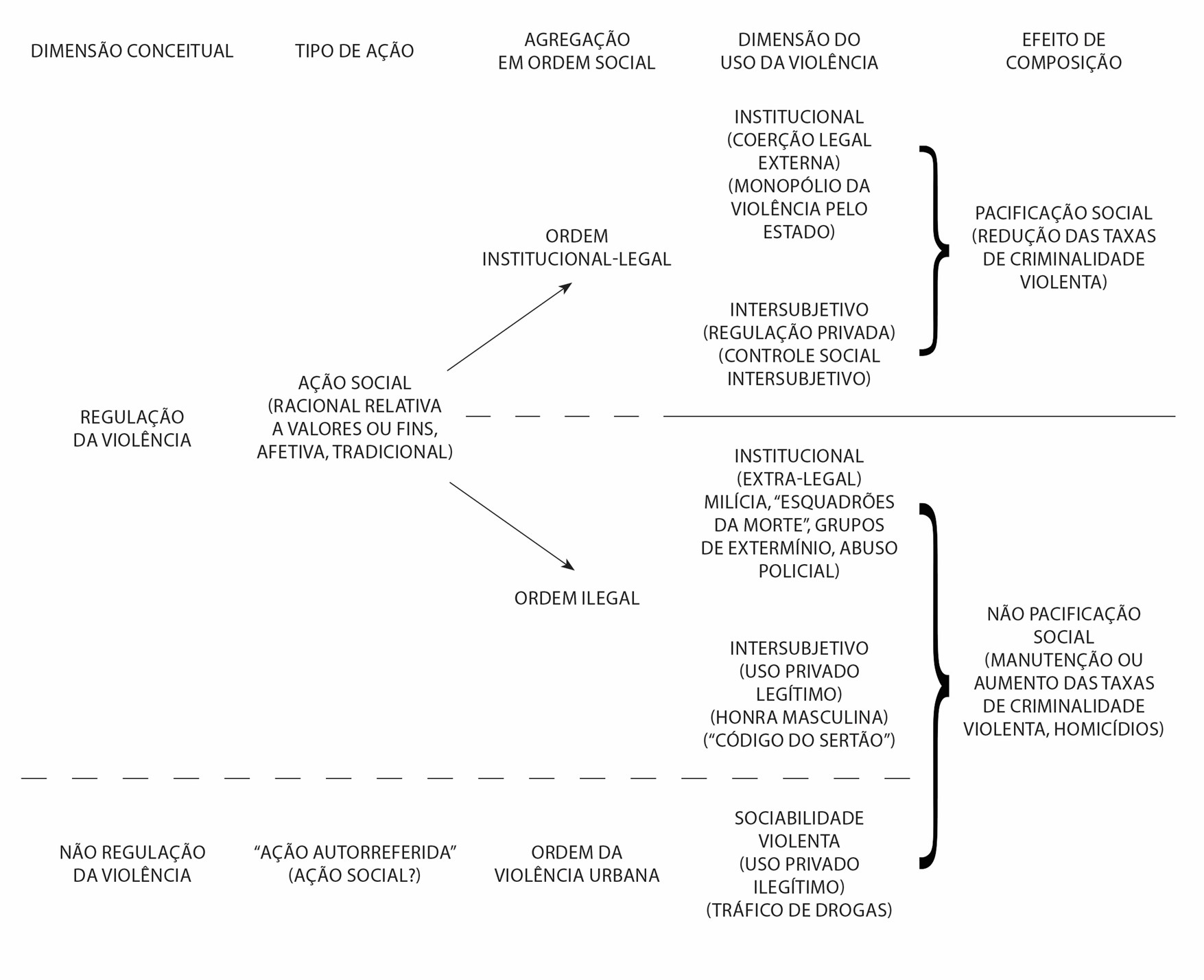 Como forma regulada e ao mesmo tempo recorrente de ação, o uso da violência assume aqui contornos diferentes daqueles vistos na ordem institucional-legal, que apontava para um processo de pacificação social. Nesse caso, estaríamos tratando de uma ordem social de regulação da violência que, de forma diferente da institucional-legal, leva ao efeito prático de não pacificação social .isto é, manutenção ou aumento das taxas de violência letal). No caso brasileiro, os dados trazidos pelas obras de Franco e Zaluar sugerem que agressões físicas são um dado invariável na nossa história, razão pela qual se deve buscar no uso legítimo da violência para fins privados a chave para entender tanto a emergência de uma ordem social na qual o uso da violência encontra-se desregulada como a tensão aludida por Machado da Silva entre esferas valorativas distintas, que coexistiriam.