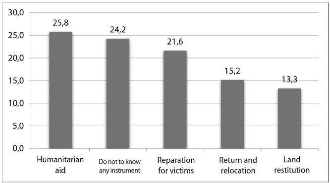 With regard to the question on the knowledge of the state tools for the post-conflict period, 25.8% of the 528 families expressed their knowledge on the tool of humanitarian aid, 24.2% evidenced that they do not to know any instrument, 21.6% identify the instrument of reparation for victims, 15.2% expressed to have knowledge on return and relocation, and the remained 13.3% know about land restitution.