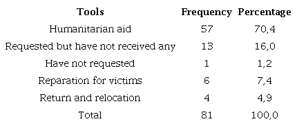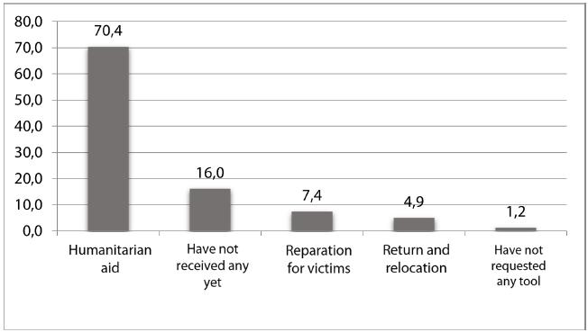 70.4% of the surveyed families stated that they have received benefits from the humanitarian aid tools, 16% expressed that they requested some of the post-conflict tools, but they have not received any yet. 7.4% have been beneficiaries of reparation for victims, 4.9%, of the return and relocation tool, and the remained 1.2% expressed they have not requested any tool.