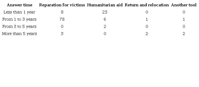 Regarding requests of post-conflict tools without answers, the longer time is presented from one to three years with a cumulative total of 78 applications of reparation for victims. It is underlined delays of more than five years for two requests of reparation for victims, two for return and relocation, and two for other tools.