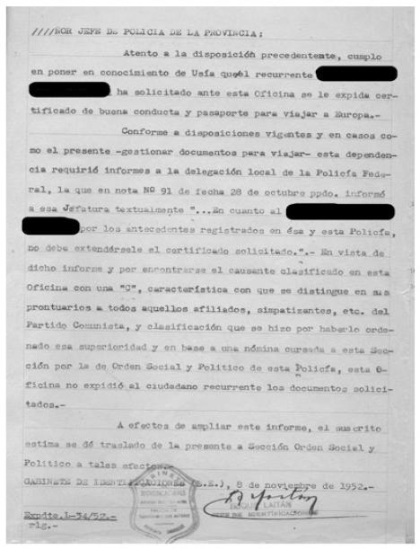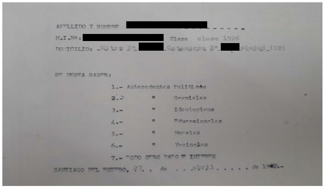 Durante el primer gobierno peronista electo en la provincia, fue creada la División de Investigaciones de la Jefatura de Policía en 1950 con la premisa de cumplir con “la importantísima función de seguridad y defensa” (EL LIBERAL, 1950, p. 66) y comprendía a las comisarías seccionales distribuidas en todo el territorio provincial de acuerdo a criterios establecidos en la reglamentación. Bajo su órbita funcionó la sección Gabinete de Identificaciones y la Sección de Orden Social y Político que mantuvo bajo seguimiento a las personas sospechadas de mantener vínculos con el comunismo, tal como se evidencia en el documento elaborado por el Gabinete de Identificaciones que consta en la Imagen 1.