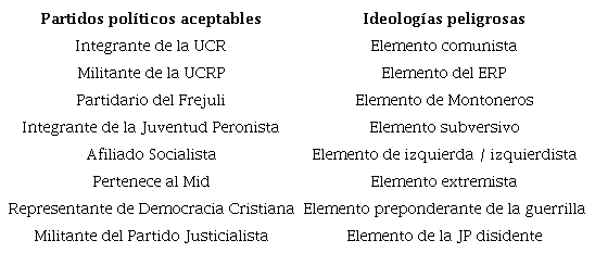 La pertenencia a partidos políticos no despierta las mismas sospechas como si ocurre con la ideología, cuyo sentido puede ser comprendido en relación a la idea de subversión vertida en Reglamento RE 9-51 Instrucción de lucha contra elementos subversivos. Esto es: “la acción clandestina o abierta, insidiosa o violenta que busca la alteración o la destrucción de los criterios morales y la forma de vida de un pueblo, con la finalidad de tomar el poder e imponer desde él una nueva forma basada en la escala de valores diferente (MINISTERIO DE JUSTICIA Y DERECHOS HUMANOS y INFOJUS, 2015, pp. 8-9). Los militantes, afiliados, partidarios fueron objeto de la vigilancia pero no porque encarnan un enemigo subversivo.