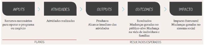 Logo, representada em um diagrama, a teoria de mudança registra a seguinte lógica: a ocorrência do impacto social é possível, mas incerta e condicionada à cadeia de consequências. Apenas se certos recursos forem usados para oferecer certos produtos ou serviços, serão produzidos os resultados capazes de gerar o impacto social almejado.