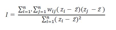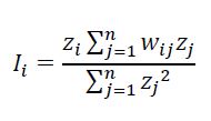 Nela, n é o número de áreas, zi é o valor do atributo da área i, é o valor médio do atributo na região e wij são os elementos da matriz normalizada de proximidade espacial. Valores positivos (entre 0 e +1) indicam para correlação direta e negativos (entre 0 e -1), uma correlação inversa.