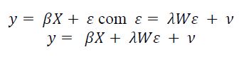 Aqui, y é a variável dependente; W é a matriz de proximidade espacial; é o termo autorregressivo que mede o grau de dependência espacial no termo de erro do modelo estimado; é o coeficiente autorregressivo; é o vetor de parâmetros relacionados às variáveis independentes; é o termo de erro que traduz a influência aleatória.