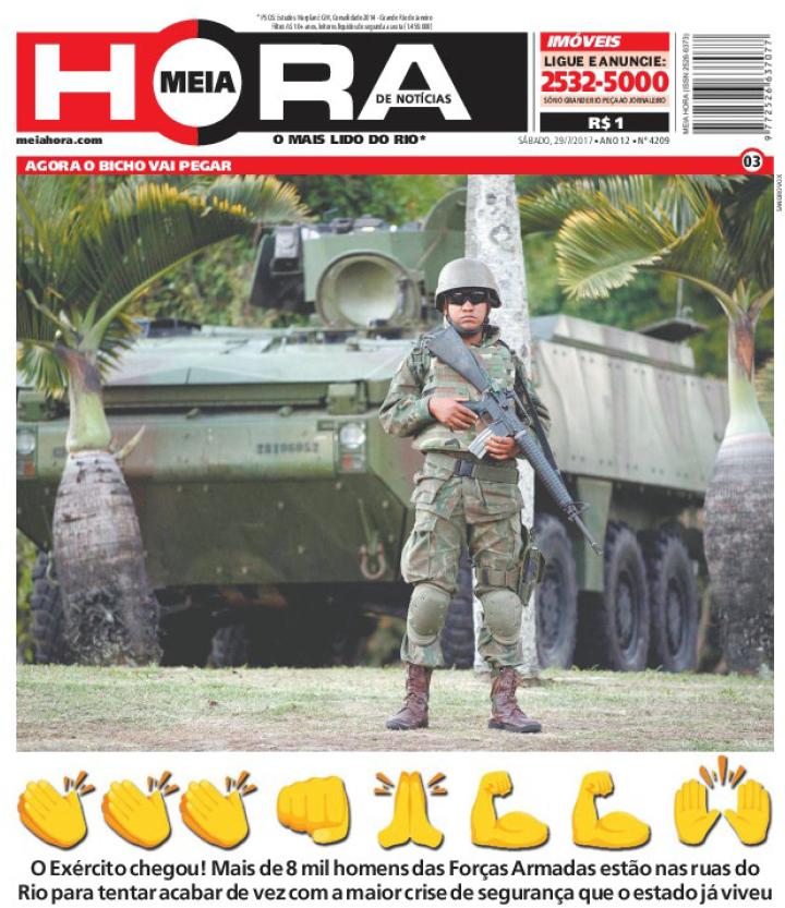 The captionless image taking up practically the entire page suggests that words are unnecessary to announce the news: the armed forces have arrived in Rio de Janeiro (‘The Army Arrived!’ the subheading below the photo exclaims, somewhat redundantly). At that moment, the dispatch of the national army was presented as a desperate measure against, as the same subheading puts it, ‘the biggest security crisis the state has ever experienced,’ something perceived, as seen in the analyses, as an outcome of the crisis in the UPPs (BARRETTO, 28/07/2017; BIANCHI, 29/07/2017).18 The humour (which I shall discuss in more detail in the next item) of this cover derives from the use of emojis, icons typically used in internet communication to represent gestures and emotional states, as if the front page were a social media post: applause; a clenched fist, two hands meeting (an image itself a kind of visual pun since many people point out its ambiguity as either a prayer or a high-five greeting); two arms displaying muscles, thus showing force; and finally two raised hands indicating movement and/or commemoration: ‘Hallelujah!’ ‘Thank God!’-signs both of celebration and of ‘it was about time!’ In the process, the tabloid simultaneously expresses the idea that Rio de Janeiro is immersed in chaos and that its analysis based on a ‘war’ (LEITE, 2000, 2012; GRILLO, 2019) of police versus criminals is set to change: a bigger force has turned up. Up until then, the routine of the state had been otherwise. The research showed that this period, which today tends to be called ‘the UPP era,’ corresponded to a routine, precisely what I am interested in analysing here.