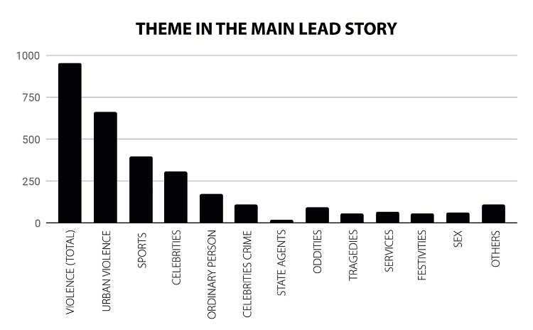 As a typical tabloid newspaper, therefore, Meia Hora, as could be seen in the research, privileges lead stories on (in decreasing order of occurrences): ‘violence,’24 sports and celebrities. In addition, its front page also includes headlines on what could be called oddities (for example, the history of a woman married to a tree), tragedies, service provisions, festivities/gossip, and sex. Graph 1 below maps the presence of these themes in the main lead stories: