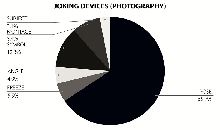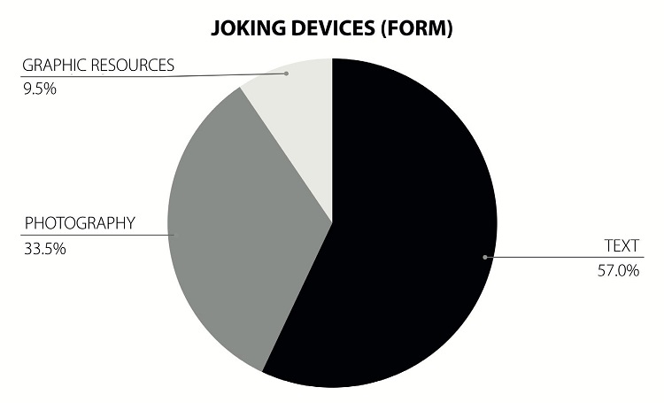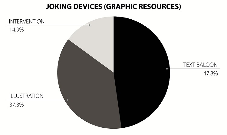 Firstly, attention can be drawn to the hegemony of the written text over the other forms-though this is unsurprising, not only because journalism is primarily a written activity but especially because the domain of what elsewhere (WERNECK, 2015a) I have called the joke-form is especially consecrated as textual. The protocol formed by a setup situation-the “presentation of the set of elements (…), the part that establishes the expectation and the set of devices around which the joke is logically constructed” (WERNECK, 2015a, p. 491)-and the punchline-“the part that establishes the turn in the situation that will produce the humoristic effect” (WERNECK, 2015a)-is facilitated by the textual grammatical structure. Furthermore, observing the subdivision of this type into its specific humorous devices, as shown in Graph 3, we can see the set of resources available to the editors to make jokes: