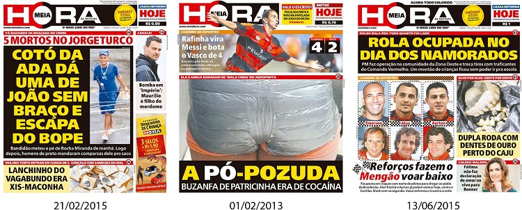 When it comes to so-called ‘popular’ or ‘tabloid’ newspapers, their specificity needs to be conceived, then, in terms of a pragmatics concerning their specific way of operationalizing this balancing, a way capable of characterizing it in the same terms by the actors themselves. In the social sciences, works on journalism in a broad sense and on tabloid journalism in particular are generally dedicated to a sociology critical of these media outlets as apparatuses of knowledge/power (for a synthesis, see NEVEU, 2001). The areas of communication and studies of language tend to invest more in discussions on their characterization and the mechanics of their fundamental operations-see, for example, Atallah and Nogueira (2012); Mota e Mota and Souza (2012); Freire and Valente (2014); Moura (2015), Valentim (2016), Costa and Menezes (2016), all on the specific case of Meia Hora, as well as the previously cited Amaral (2006) and Costa (2016). To undertake a sociology of critique in/of journalism (LEMIEUX, 2000) it is necessary to take seriously not only the critical operations made in the ‘media’ (an idea itself an idealization of a constructed unit) as insights into the news media’s interpellation/verification/effectuation, but also-and primordially-the critical operations made as a public discourse in/by the media outlets as constructions to be analysed themselves. Without ignoring the need for a critical examination of the discourses of the newspapers, it is also necessary to set aside this task for now in order-without redounding in an analytic naivety-to take seriously the specific mechanics of the critique produced on the interface between journalism and social life (of which journalism obviously forms part). Thus, the idea itself of a tabloid newspaper should be explored not only in terms of its project (commercial, epistemological, political) but also in terms of its praxeology: how it functions, how it produces meanings, what results from them in terms of social phenomenon. It is necessary to think, therefore, about what a ‘tabloid newspaper’ is a posteriori to the observation, specifically how it is understood by the social actors involved, and not just think about it a priori as a device designed to manipulate them. Along these lines, the exhaustive observation of the covers of this specific newspaper revealed the operationalization of a specific strategy of publicist legitimation (TARDE, 2005[1901]), grounded in a game of proximity that simultaneously seeks to equalize and horizontalize the dialogue between newspaper and reader, and also effectuate its public character through an intensive thematic agenda (less diverse than that of traditional newspapers, based on a strategy of technical authority and an agenda of ‘big politics’ and authorized knowledge) and a set of devices for approximation with the readership (such as, for example, colloquial language and obviously, in this case, humour). In this sense, Meia Hora found its niche in comic speech by converting the critical mechanics of the newspaper into a daily operation of gracejo, the insertion of wit or grace/graça into the voice enunciating the news, creating the singular observer (WERNECK, 2019, 2021) who ultimately is legitimized by and legitimizes a complicity with the reader.