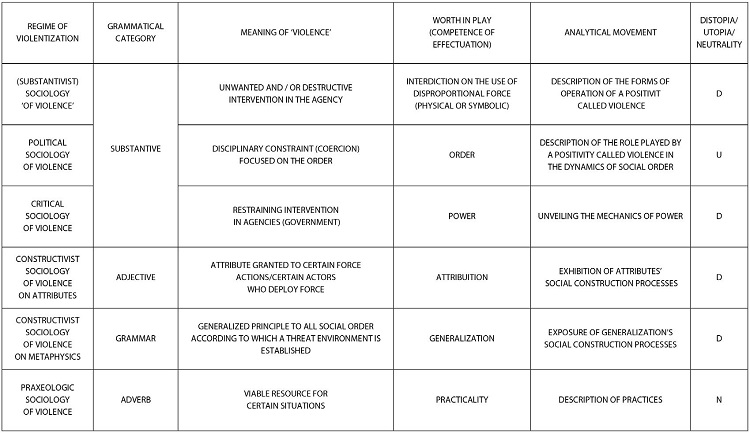 In Werneck, Teixeira and Talone (2020), I proposed with my colleagues a model for a pragmatic sociology of violence, founded on the recognition that the semiotic multiplicity of the sign violence results in a plural framework of worldviews, full-blown native theories concerning the social, ‘sociologies,’ as we call them, which imply forms of defining the situation (THOMAS, 1966[1923]) in terms of violence and, in the final instance, of behaving in relation to others and the social order itself in which the phenomenon occurs of mobilizing notable differences of force, thereby violentizing these situations. For each of these regimes of violentization there corresponds a form of defining violence and, with this definition, of defining what is happening on its basis. These different sociologies, then, represent different investments by the social actors themselves in relation to what the mobilization of force in a situation signifies and determine the way in which people situate violence-or in our terms, how they violentize the situation. Hence, it comprises a model capturing how people represent different dimensions of the situations in which they are inserted as ‘violent,’ establishing diverse definitions of what, in the situation, is considered violence. Table 2 below, taken from the cited joint work, synthesizes the different forms of violentization inferred by us:
