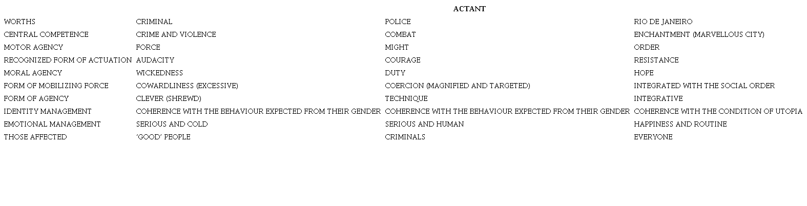 Based on the perception of this movement that implicates the three main actants in the sample, I was able to define a matrix of formal elements (WERNECK and LORETTI, 2018) characterizing these actants of urban violence. Setting out from central competences, observed in negative (WATSON, 2015) throughout the universe of tabloid covers and definitive of how each one would ideally be, it was possible to perceive the distinctions made between each and highlight other determinant characteristics.