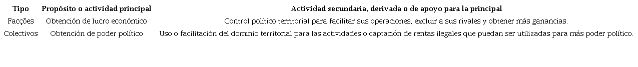 Una modalidad diferente la representarían los colectivos, quienes deberían ser ubicados en el tipo collaborative governance, en el cual un grupo armado opera en estrecha colaboración con el Estado, y en la cual unas veces el grupo armado actúa como un brazo del Estado y otras veces el Estado actúa como un brazo del grupo armado, pues trabajan juntos para gobernar un territorio especifico (ARIAS, 2018, pp. 24-25).