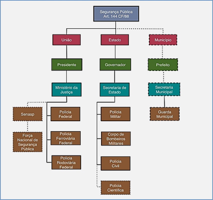 O organograma da segurança pública nacional, conforme previsão no artigo 144 da Constituição Federal (CF, BRASIL, 1988), pode ser visualizado na Figura 1.