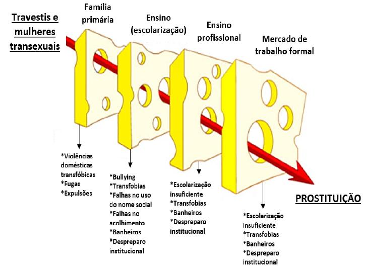 Fazendo uma analogia com o modelo do queijo suíço de James Reason (2000, p. 769) - um sistema utilizado para compreender a complexidade das causalidades de um acidente -, a prostituição se apresenta como uma condição predestinada para a maioria das travestis e mulheres transexuais, principalmente as pretas e/ou pardas, pobres e periféricas. Quando são analisados os vários fatores associados ao acesso ampliado às outras oportunidades de trabalho e renda, a prostituição se apresenta como um produto de um conjunto de falhas, ou como pode ser visualizado na Figura 1, o resultado de uma conjunção e sucessão de falhas que se alinham por meio dos buracos em um queijo suíço.