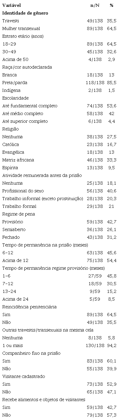 Todas as pessoas que se autodeclararam travesti, mulher transexual ou mulher, identificadas por esses meios, foram incluídas no estudo, exceto aquelas com um tempo de permanência inferior a dois meses na unidade prisional, tempo considerado apropriado pelos pesquisadores para que as participantes pudessem se adaptar às rotinas existentes na unidade prisional e para o cadastramento de possíveis visitantes. Um total de 138 travestis e mulheres transexuais participaram do estudo. Ao longo dessa pesquisa, não houve nenhuma situação de recusa ou de desistência de participação.
