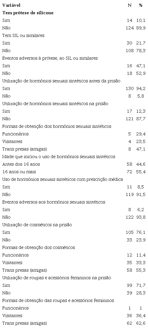 A maioria das participantes, 130 (94,2%), revelou ter utilizado hormônios sintéticos sexuais antes do aprisionamento. No estudo realizado no Rio de Janeiro, também houve grande prevalência de utilização desses medicamentos, utilizados por 93,4% das travestis e por 89,3% das mulheres transexuais (HERNÁNDEZ et al., 2022). Em contraste com esses elevados percentuais de utilização fora das prisões, no momento da entrevista, apenas 17 (12,3%) delas utilizavam esses produtos, sinalizando dificuldades maiores na obtenção dessas tecnologias de gênero.