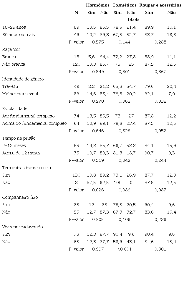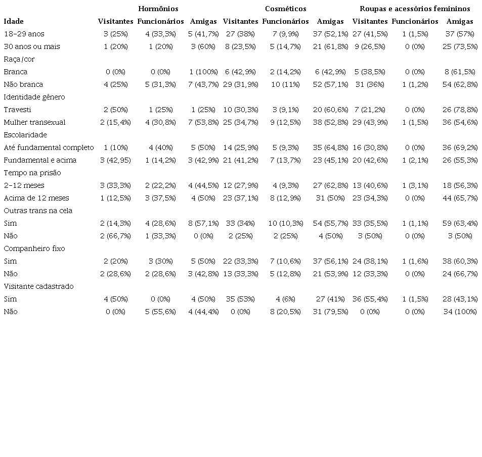As associações realizadas entre as formas de obtenção de hormônios, cosméticos, roupas e acessórios, com as variáveis sociais e prisionais (Tabela 4), demonstraram que essas tecnologias materiais foram obtidas por meio de outras travestis e mulheres transexuais em situação de prisão. Nesse sentido, destaca-se a produção de roupas e de acessórios por meio de roupas masculinas, em que qualquer peça do vestuário masculino se torna calcinha, saia, blusa e outra vestimenta feminina. E diversos acessórios são produzidos de forma artesanal, como anéis, colares e pulseiras. Entretanto, a improvisação de alguns produtos para a obtenção de cosméticos é algo visto, e preocupante pelo potencial agravo à saúde, já que foi relatada a produção de cosméticos por meio sucos em pós coloridos, além de sombras e delineadores de sobrancelhas feitos através de fuligem preta da combustão de produtos de plástico. Essas situações também foram apontadas por Céu Cavalcanti e Vanessa Sander (2019, p. 21). Segundo as autoras, há relatos de corretivos de texto e de temperos se tornarem esmaltes e maquiagens.