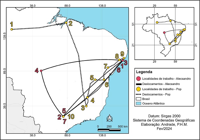 Inspirados em etnografias móveis (JAIN, 2009; NOVOA, 2015) realizamos, nos últimos quatro anos, jornadas de ônibus e vans entre cidades do Nordeste (Pernambuco, Alagoas, Sergipe e Bahia), do Centro-Oeste (Goiás, Mato Grosso e Mato Grosso do Sul) e do Sudeste (Minas Gerais e São Paulo) (PINHO; RODRIGUES; ZAMBON, 2023). Essas jornadas seguiram deslocamentos de pessoas e bens mediante o diálogo com diferentes interlocutores. Compartilhamos as jornadas junto de pessoas que nos colocaram em posição de pensar tanto as utilidades do movimento quanto os deslocamentos de sentido de suas vidas. As motivações que levam indivíduos a se moverem não são estáticas, elas se transformam nos cursos de vida entrelaçados aos percursos pelo território, muitas vezes tomando a forma de sofrimentos psíquicos ou de impulsos esperançosos de renovação. As transformações das ideias e emoções (SALAZAR; ELLIOT; NORUM, 2017) assim, ajudam a movimentar as redes interpessoais e sociotécnicas, junto de seus sentidos. Os caminhos para atingir uma meta ou para ancorar os afetos em meio ao fluxo da vida mutante também produzem mercados e políticas, inclusive as violentas.